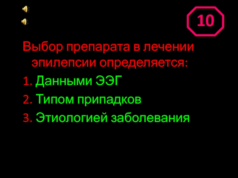 Слайд 10Выбор препарата в лечении эпилепсии определяется: