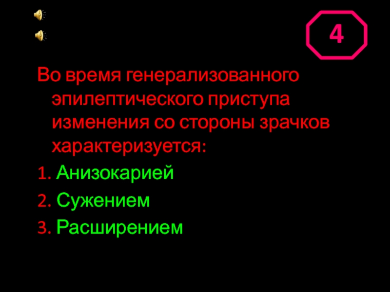 Слайд 4Во время генерализованного эпилептического приступа изменения со стороны зрачков характеризуется:
