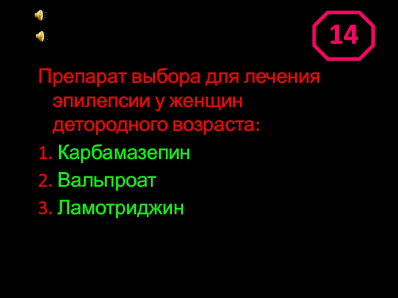 Слайд 14Препарат выбора для лечения эпилепсии у женщин детородного возраста: