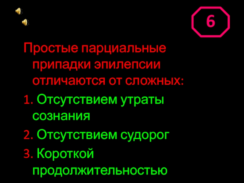 Слайд 6Простые парциальные припадки эпилепсии отличаются от сложных: