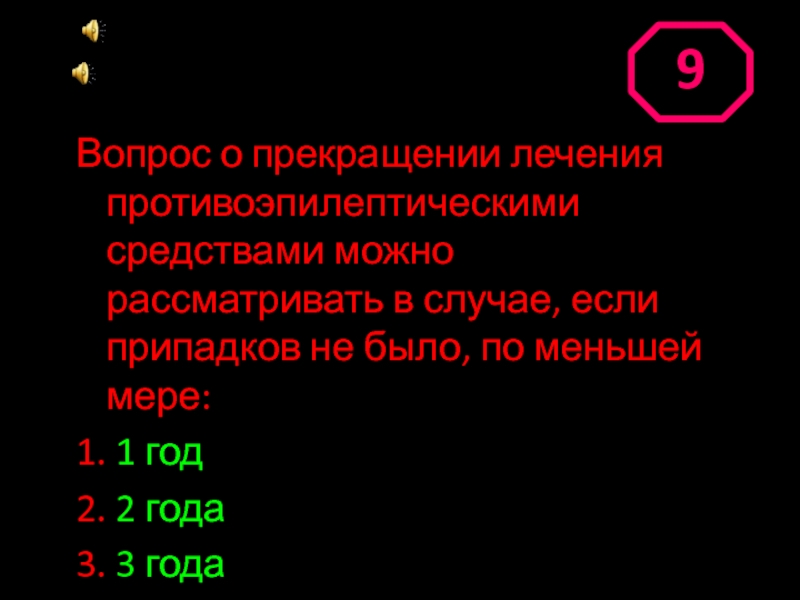 Слайд 9Вопрос о прекращении лечения противоэпилептическими средствами можно рассматривать в случае,