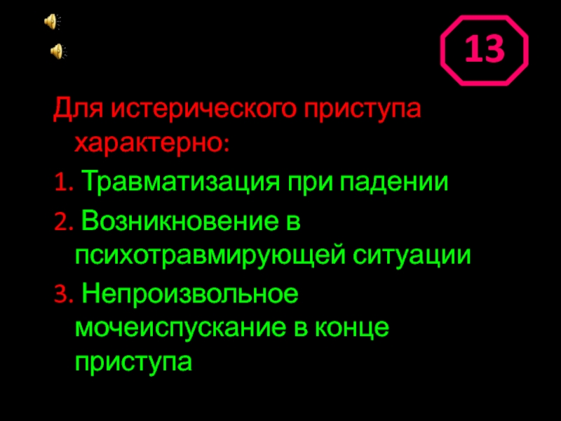 Для истерического приступа характерно:1. Травматизация при падении2. Возникновение в психотравмирующей ситуации3. Непроизвольное мочеиспускание в конце приступа