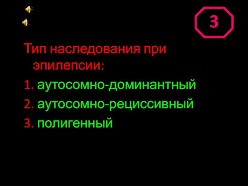 Тип наследования при эпилепсии:1. аутосомно-доминантный2. аутосомно-рециссивный3. полигенный