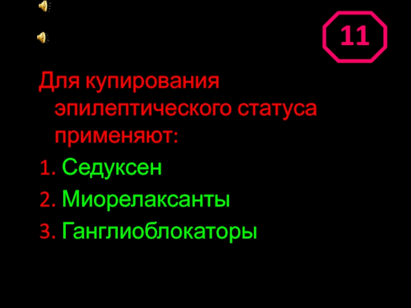 Для купирования эпилептического статуса применяют:1. Седуксен2. Миорелаксанты3. Ганглиоблокаторы