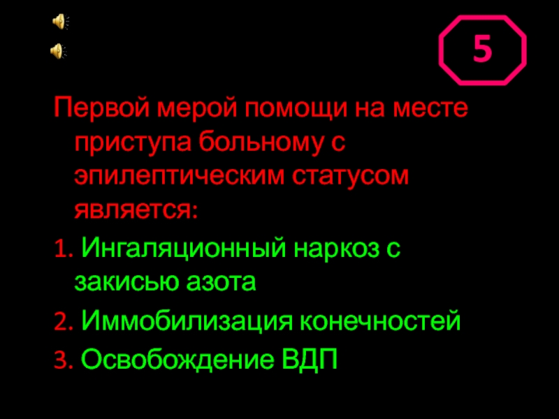 Слайд 5Первой мерой помощи на месте приступа больному с эпилептическим статусом