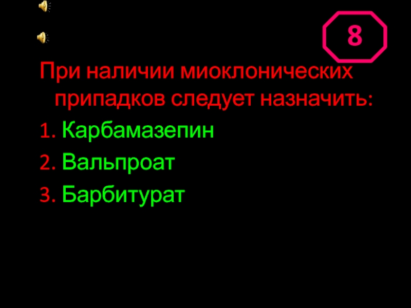 Слайд 8При наличии миоклонических припадков следует назначить: