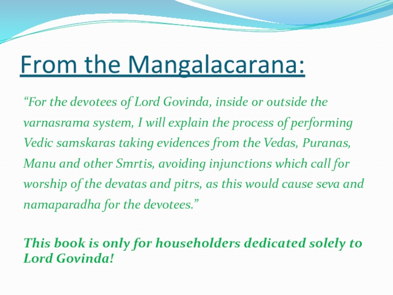 performing Vedic samskaras taking evidences from the Vedas, Puranas, Manu and other Smrtis, avoiding injunctions which call for worship of the devatas and pitrs, as this would cause seva and namaparadha for the devotees.”
