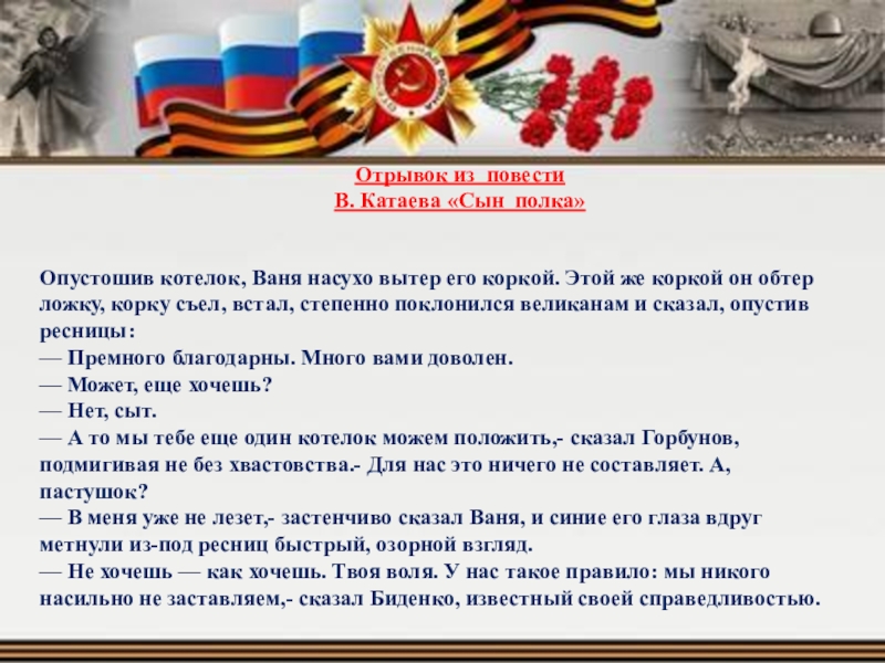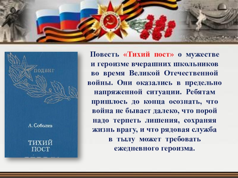 войны в нашей литературе, до сих пор волнует как писателей, так и читателей. К сожалению, постепенно уходят из жизни авторы, которые знали о войне не понаслышке, но они оставили для нас в талантливых произведениях своё проникновенное видение событий, сумев передать атмосферу горьких, ужасных и вместе с тем торжественных и героических лет.