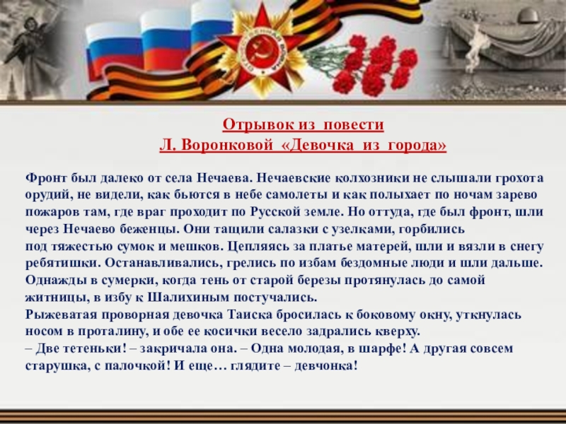 и как полыхает по ночам зарево пожаров там, где враг проходит по Русской земле. Но оттуда, где был фронт, шли через Нечаево беженцы. Они тащили салазки с узелками, горбились под тяжестью сумок и мешков. Цепляясь за платье матерей, шли и вязли в снегу ребятишки. Останавливались, грелись по избам бездомные люди и шли дальше.