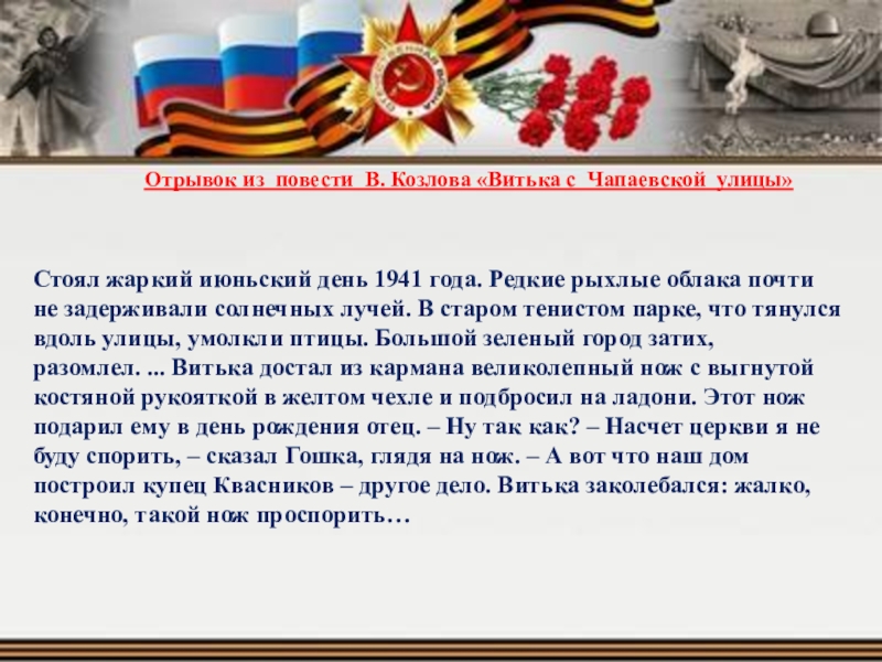 войны, как и весь русский народ. Так пришло к ним взросление. Повестью «Витька с Чапаевской улицы» В. Козлова зачитывалось не одно поколение мальчишек и девчонок.