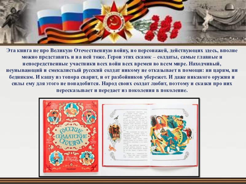 сказок – солдаты, самые главные и непосредственные участники всех войн всех времен во всем мире. Находчивый, неунывающий и смекалистый русский солдат никому не отказывает в помощи: ни царям, ни беднякам. И кашу из топора сварит, и от разбойников убережет. И даже никакого оружия и силы ему для этого не понадобится. Народ своих солдат любит, поэтому и сказки про них пересказывает и передает из поколения в поколение.