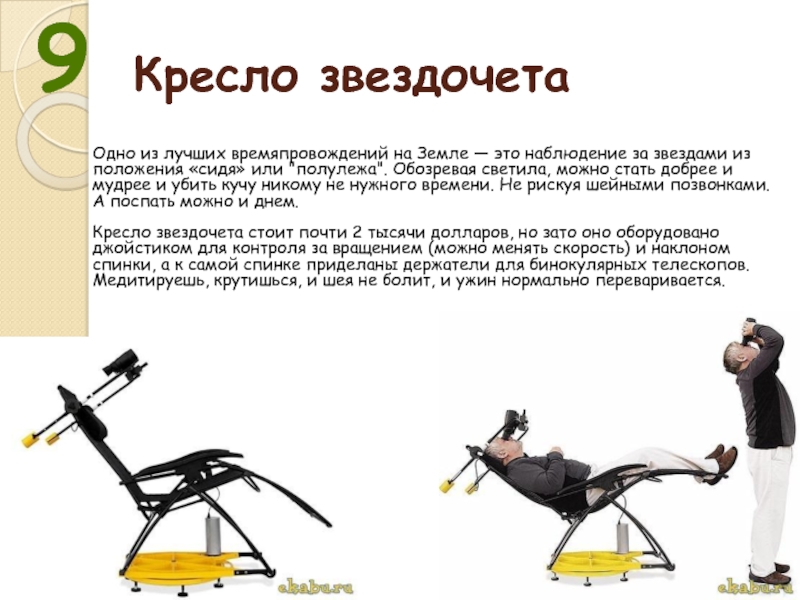 стать добрее и мудрее и убить кучу никому не нужного времени. Не рискуя шейными позвонками. А поспать можно и днем. Кресло звездочета стоит почти 2 тысячи долларов, но зато оно оборудовано джойстиком для контроля за вращением (можно менять скорость) и наклоном спинки, а к самой спинке приделаны держатели для бинокулярных телескопов. Медитируешь, крутишься, и шея не болит, и ужин нормально переваривается.9