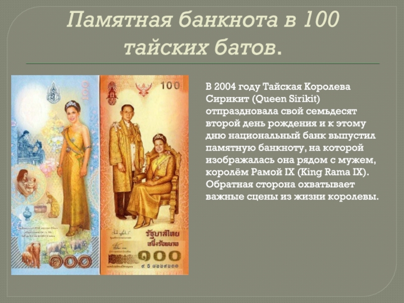 Памятная банкнота в 100 тайских батов.В 2004 году Тайская Королева Сирикит (Queen Sirikit) отпраздновала свой семьдесят второй