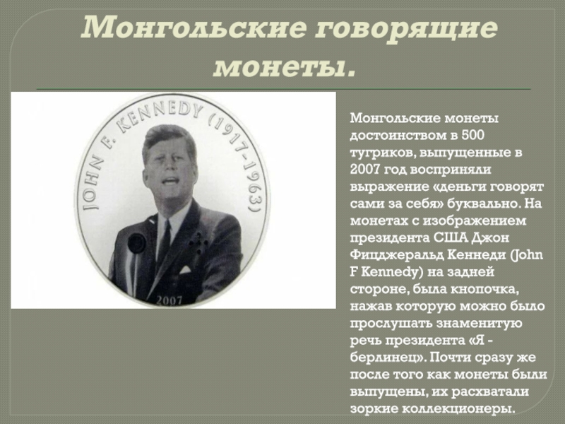 На монетах с изображением президента США Джон Фицджеральд Кеннеди (John F Kennedy) на задней стороне, была кнопочка, нажав которую можно было прослушать знаменитую речь президента «Я - берлинец». Почти сразу же после того как монеты были выпущены, их расхватали зоркие коллекционеры.