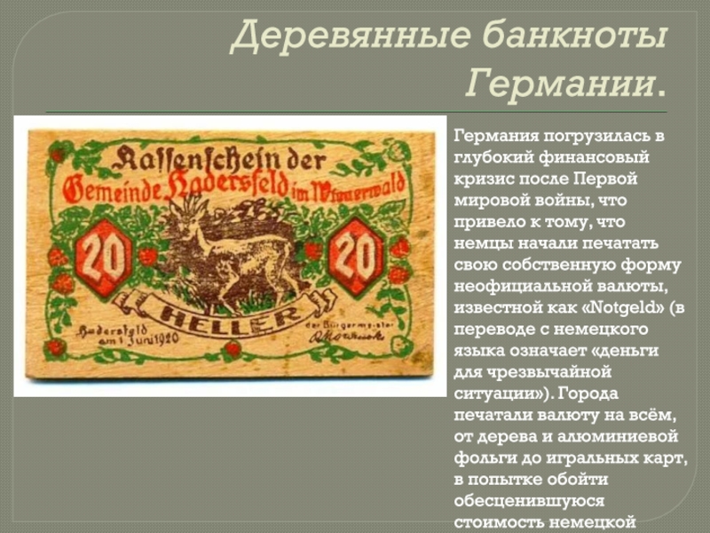 свою собственную форму неофициальной валюты, известной как «Notgeld» (в переводе с немецкого языка означает «деньги для чрезвычайной ситуации»). Города печатали валюту на всём, от дерева и алюминиевой фольги до игральных карт, в попытке обойти обесценившуюся стоимость немецкой марки.