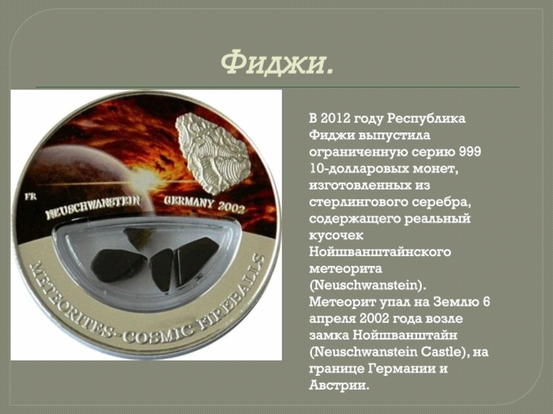 Фиджи. В 2012 году Республика Фиджи выпустила ограниченную серию 999 10-долларовых монет, изготовленных из стерлингового серебра, содержащего реальный кусочек Нойшванштайнского метеорита (Neuschwanstein). Метеорит упал на Землю 6 апреля 2002 года возле