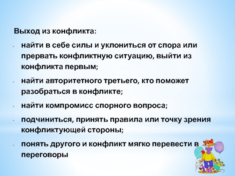 Выход из конфликта:найти в себе силы и уклониться от спора или прервать конфликтную ситуацию, выйти из