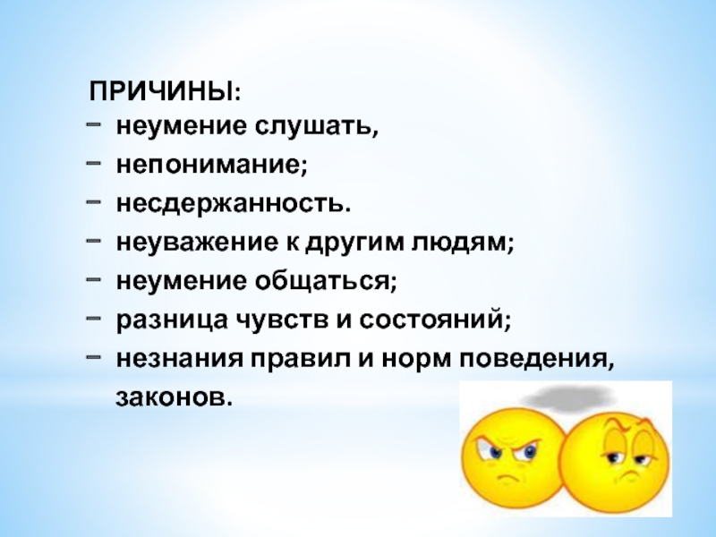 ПРИЧИНЫ:неумение слушать, непонимание;несдержанность.неуважение к другим людям;неумение общаться;разница чувств и состояний;незнания правил и норм поведения, законов.