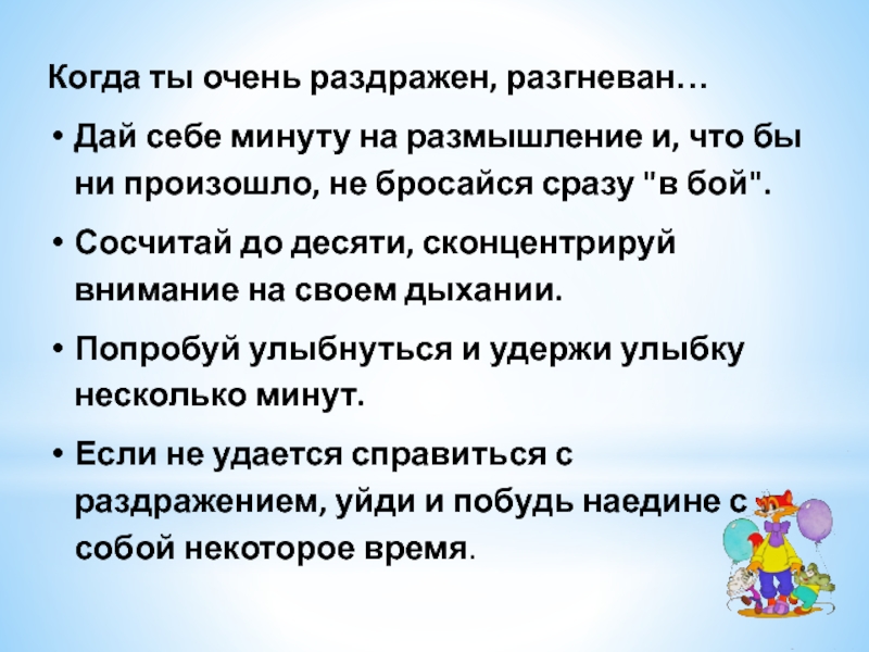 Когда ты очень раздражен, разгневан…Дай себе минуту на размышление и, что бы ни произошло, не бросайся сразу