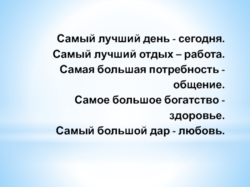 Самый лучший день - сегодня. Самый лучший отдых – работа. Самая большая потребность - общение. Самое большое