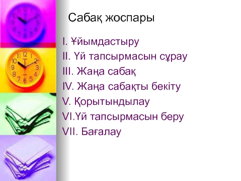 Сабақ жоспарыI. ҰйымдастыруII. Үй тапсырмасын сұрауIII. Жаңа сабақIV. Жаңа сабақты бекітуV. ҚорытындылауVI.Үй тапсырмасын беруVII. Бағалау