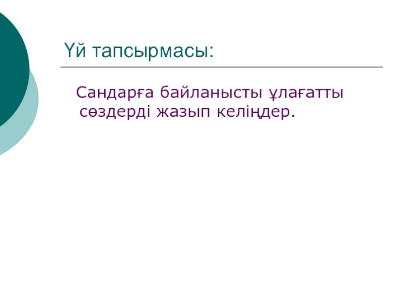 Үй тапсырмасы: Сандарға байланысты ұлағатты сөздерді жазып келіңдер.