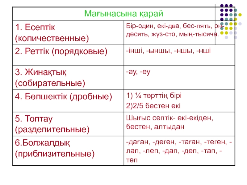 Мағынасына қарай 6 түрі бар: есептік сан есім, реттік