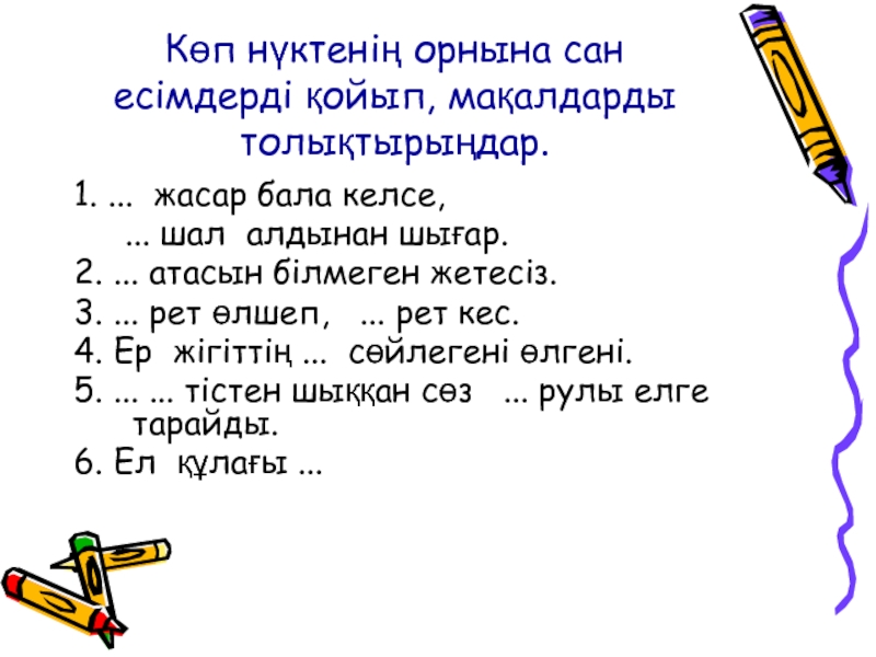 Слайд 9Көп нүктенің орнына сан есімдерді қойып, мақалдарды толықтырыңдар.