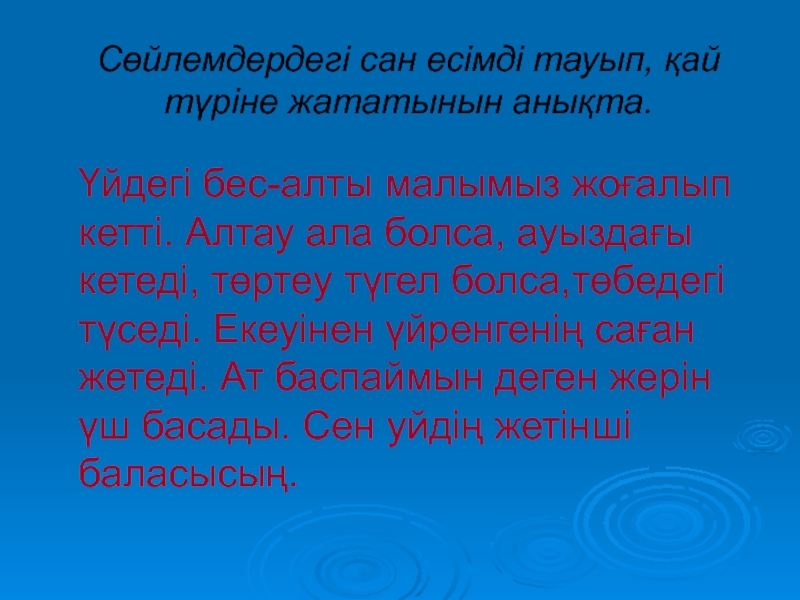 Слайд 7Сөйлемдердегі сан есімді тауып, қай түріне жататынын анықта.