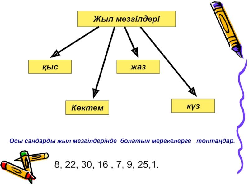 Жыл мезгілдеріқысКөктемжазкүз8, 22, 30, 16 , 7, 9, 25,1.Осы сандарды жыл мезгілдерінде болатын мерекелерге  топтаңдар.