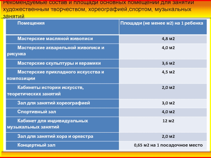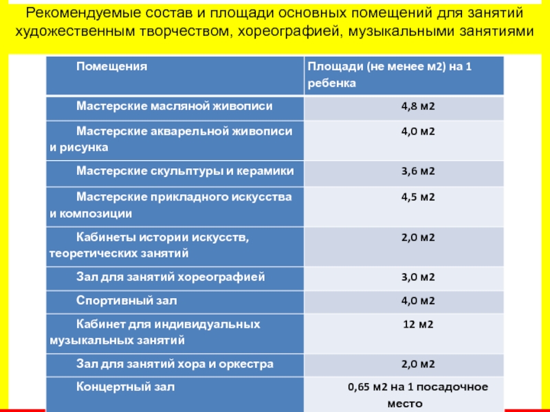 Слайд 27Рекомендуемые состав и площади основных помещений для занятий художественным творчеством,