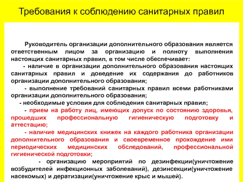 - наличие в организации дополнительного образования настоящих санитарных правил и доведение их содержания до работников организации дополнительного образования;