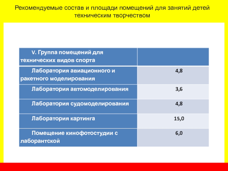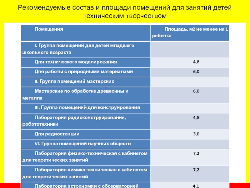 Слайд 25Рекомендуемые состав и площади помещений для занятий детей техническим творчеством