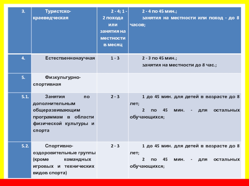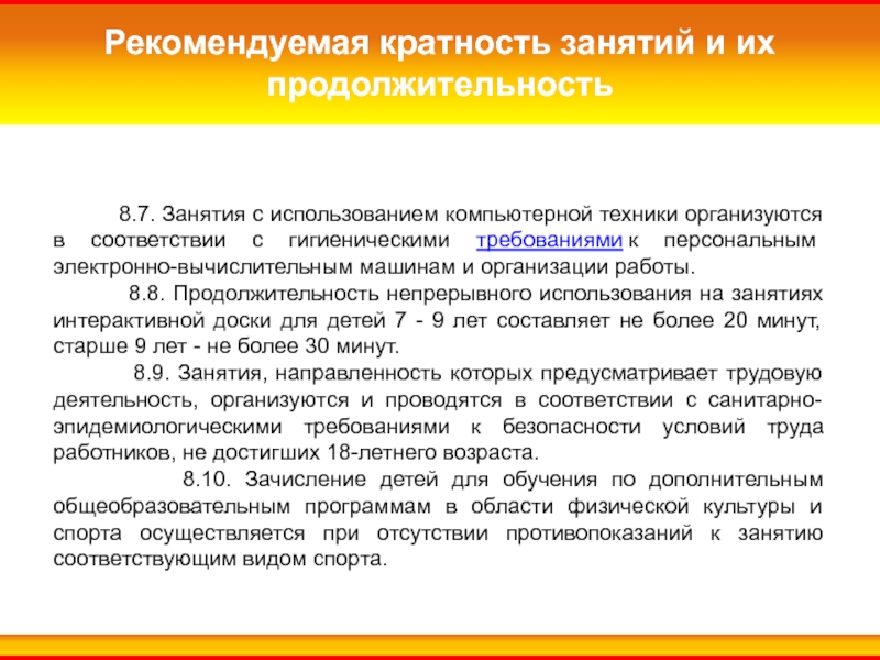 Слайд 29РЕКОМЕНДУЕМЫЙ РЕЖИМ ЗАНЯТИЙ ДЕТЕЙ В ОРГАНИЗАЦИЯХ ДОПОЛНИТЕЛЬНОГО ОБРАЗОВАНИЯ