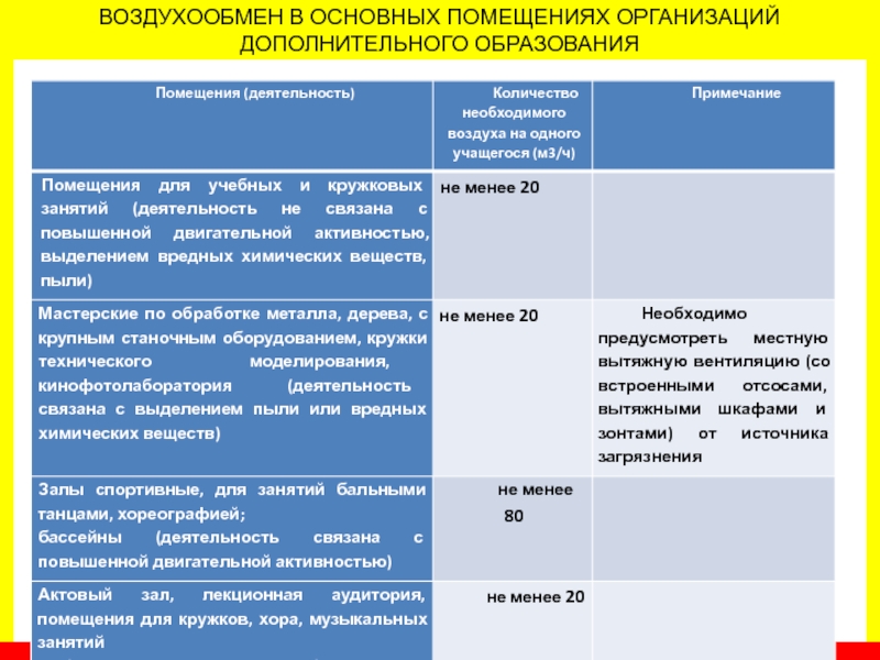 Слайд 28ВОЗДУХООБМЕН В ОСНОВНЫХ ПОМЕЩЕНИЯХ ОРГАНИЗАЦИЙ ДОПОЛНИТЕЛЬНОГО ОБРАЗОВАНИЯ