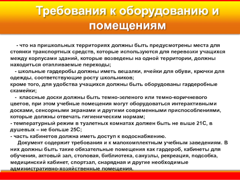 Документ содержит требования и к малокомплектным учебным заведениям. В них должны быть такие обязательные помещения как гардероб, кабинеты для обучения, актовый зал, столовая, библиотека, санузлы, рекреация, подсобка, медицинский кабинет, спортзал, снарядная и другие необходимые административно-хозяйственные помещения.
