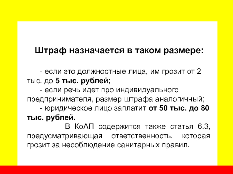 В КоАП содержится также статья 6.3, предусматривающая ответственность, которая грозит за несоблюдение санитарных правил.