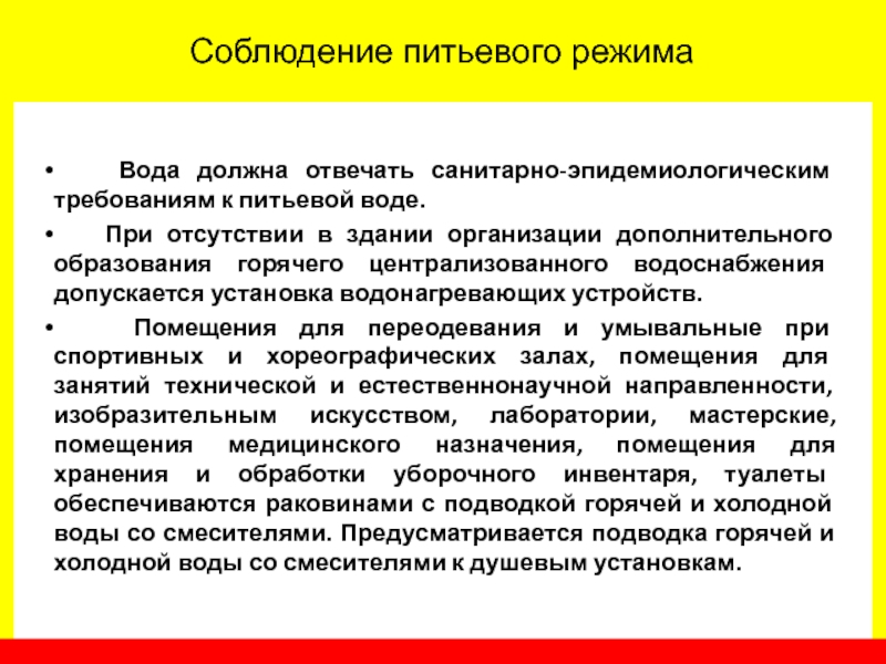 Помещения для переодевания и умывальные при спортивных и хореографических залах, помещения для занятий технической и естественнонаучной направленности, изобразительным искусством, лаборатории, мастерские, помещения медицинского назначения, помещения для хранения и обработки уборочного инвентаря, туалеты обеспечиваются раковинами с подводкой горячей и холодной воды со смесителями. Предусматривается подводка горячей и холодной воды со смесителями к душевым установкам.