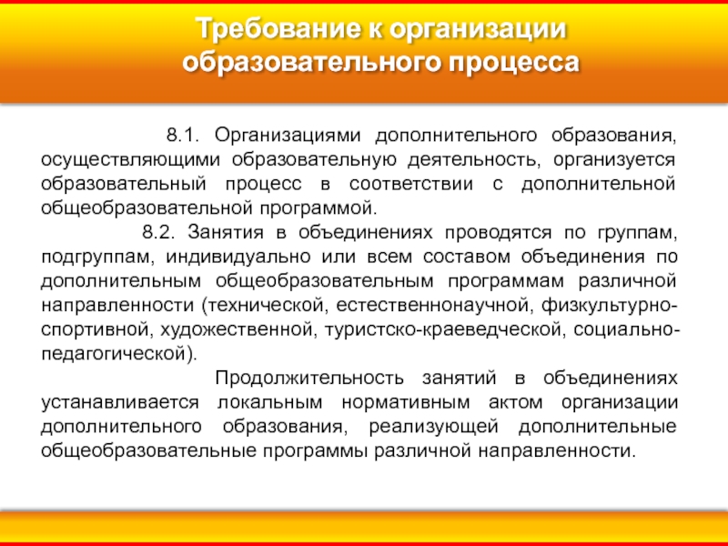 8.2. Занятия в объединениях проводятся по группам, подгруппам, индивидуально или всем составом объединения по дополнительным общеобразовательным программам различной направленности (технической, естественнонаучной, физкультурно-спортивной, художественной, туристско-краеведческой, социально-педагогической).