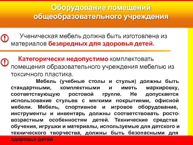 Мебель (учебные столы и стулья) должны быть стандартными, комплектными и иметь маркировку, соответствующую ростовой группе. Не допускается использование стульев с мягкими покрытиями, офисной мебели. Мебель, спортивное и игровое оборудование, инструменты и инвентарь должны соответствовать росто-возрастным особенностям детей. Технические средства обучения, игрушки и материалы, используемые для детского и технического творчества, должны быть безопасными для здоровья детей.