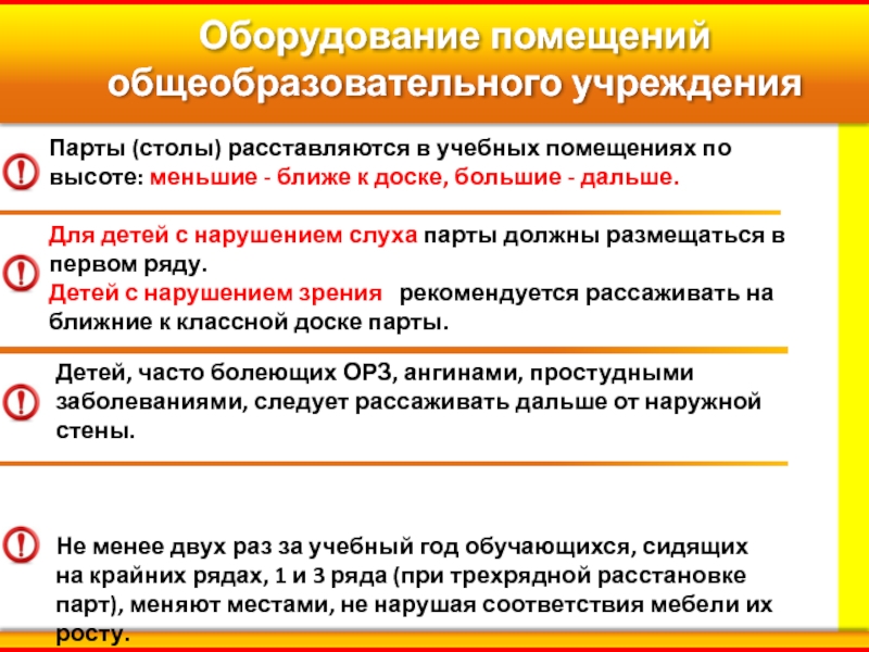 Не менее двух раз за учебный год обучающихся, сидящих на крайних рядах, 1 и 3 ряда (при трехрядной расстановке парт), меняют местами, не нарушая соответствия мебели их росту.