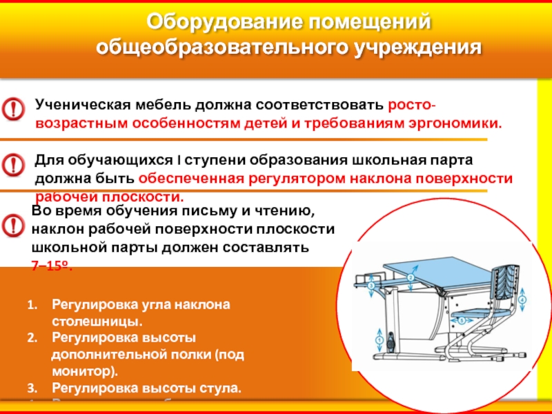 Для обучающихся I ступени образования школьная парта должна быть обеспеченная регулятором наклона поверхности рабочей плоскости.