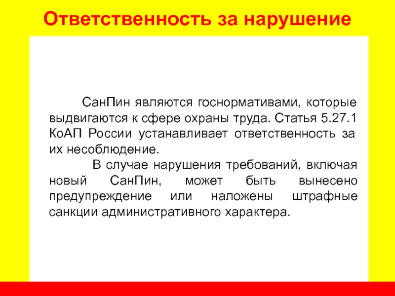 В случае нарушения требований, включая новый СанПин, может быть вынесено предупреждение или наложены штрафные санкции административного характера.