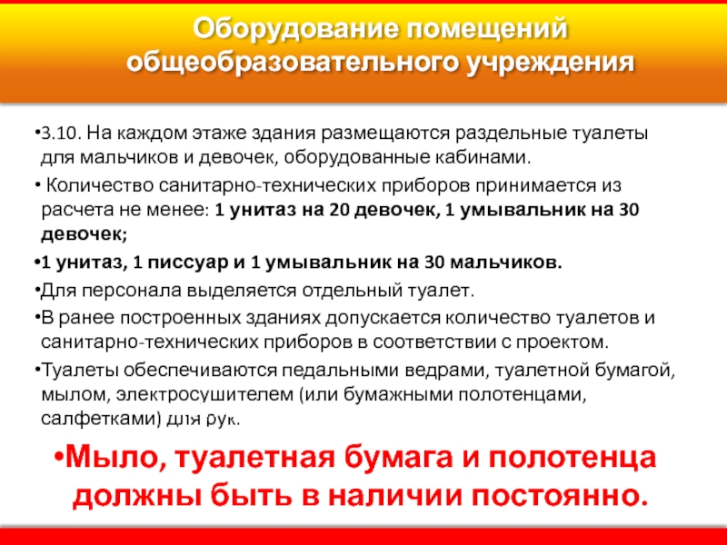 Мыло, туалетная бумага и полотенца должны быть в наличии постоянно.