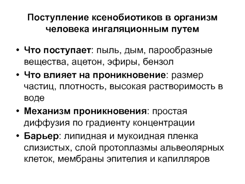 Слайд 21Поступление ксенобиотиков в организм человека ингаляционным путем