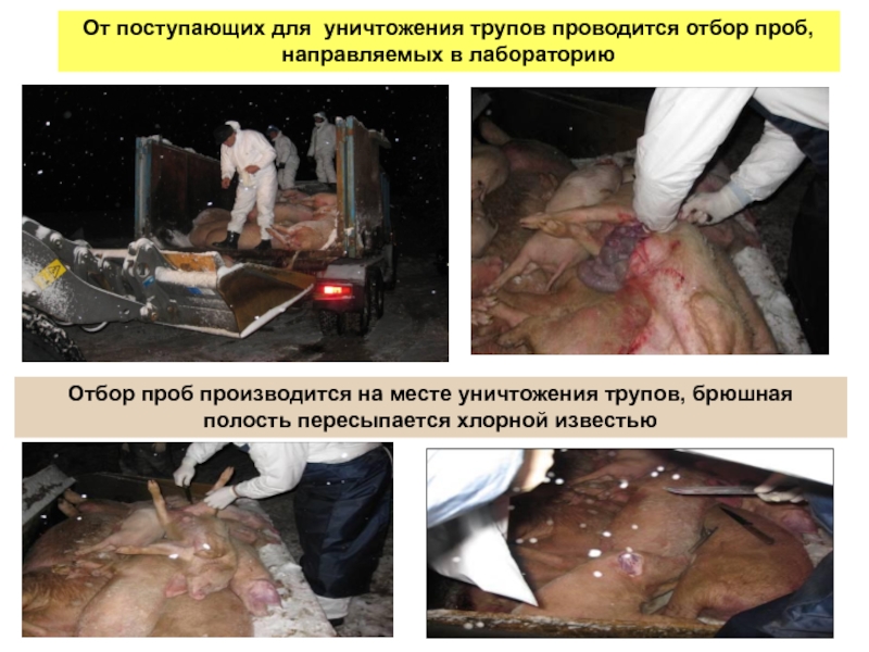 Слайд 27От поступающих для уничтожения трупов проводится отбор проб, направляемых в
