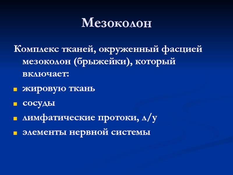 Комплекс тканей, окруженный фасцией мезоколон (брыжейки), который включает: