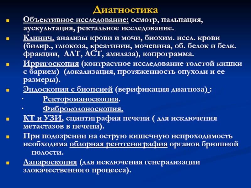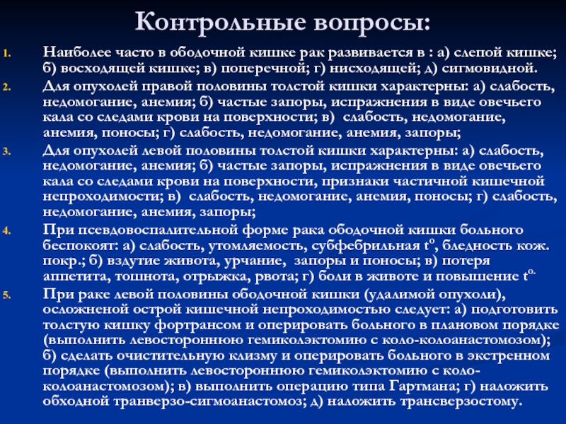 Для опухолей левой половины толстой кишки характерны: а) слабость, недомогание, анемия; б) частые запоры, испражнения в виде овечьего кала со следами крови на поверхности, признаки частичной кишечной непроходимости; в) слабость, недомогание, анемия, поносы; г) слабость, недомогание, анемия, запоры;