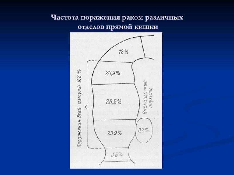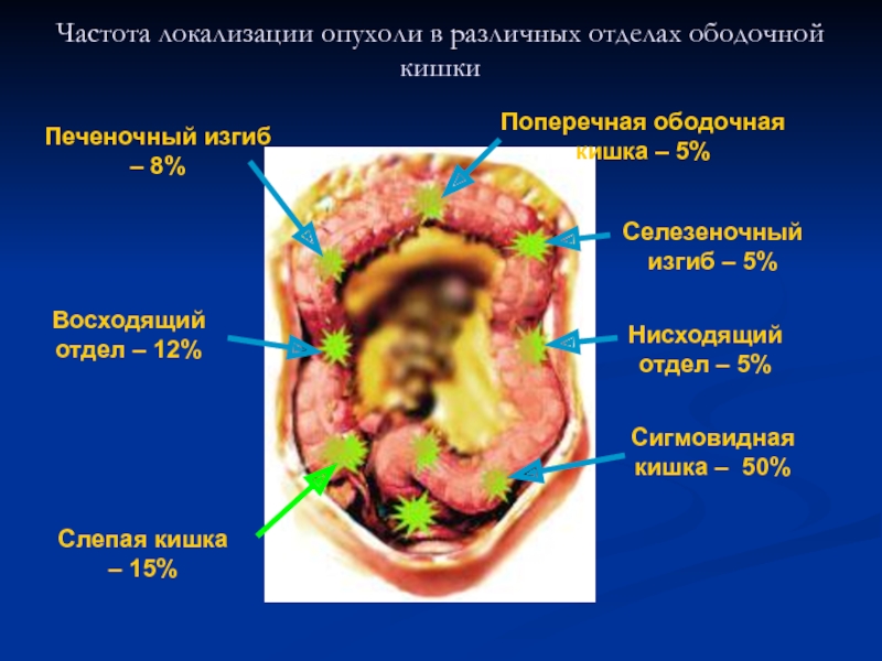 Слайд 16Частота локализации опухоли в различных отделах ободочной кишки