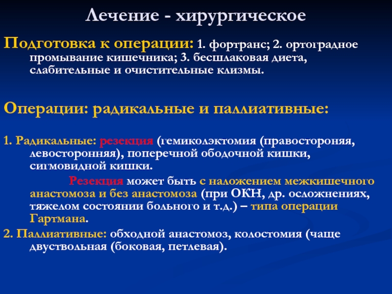 При раке левой половины ободочной кишки (удалимой опухоли), осложненой острой кишечной непроходимостью следует: а) подготовить толстую кишку фортрансом и оперировать больного в плановом порядке (выполнить левостороннюю гемиколэктомию с коло-колоанастомозом); б) сделать очистительную клизму и оперировать больного в экстренном порядке (выполнить левостороннюю гемиколэктомию с коло-колоанастомозом); в) выполнить операцию типа Гартмана; г) наложить обходной транверзо-сигмоанастомоз; д) наложить трансверзостому.